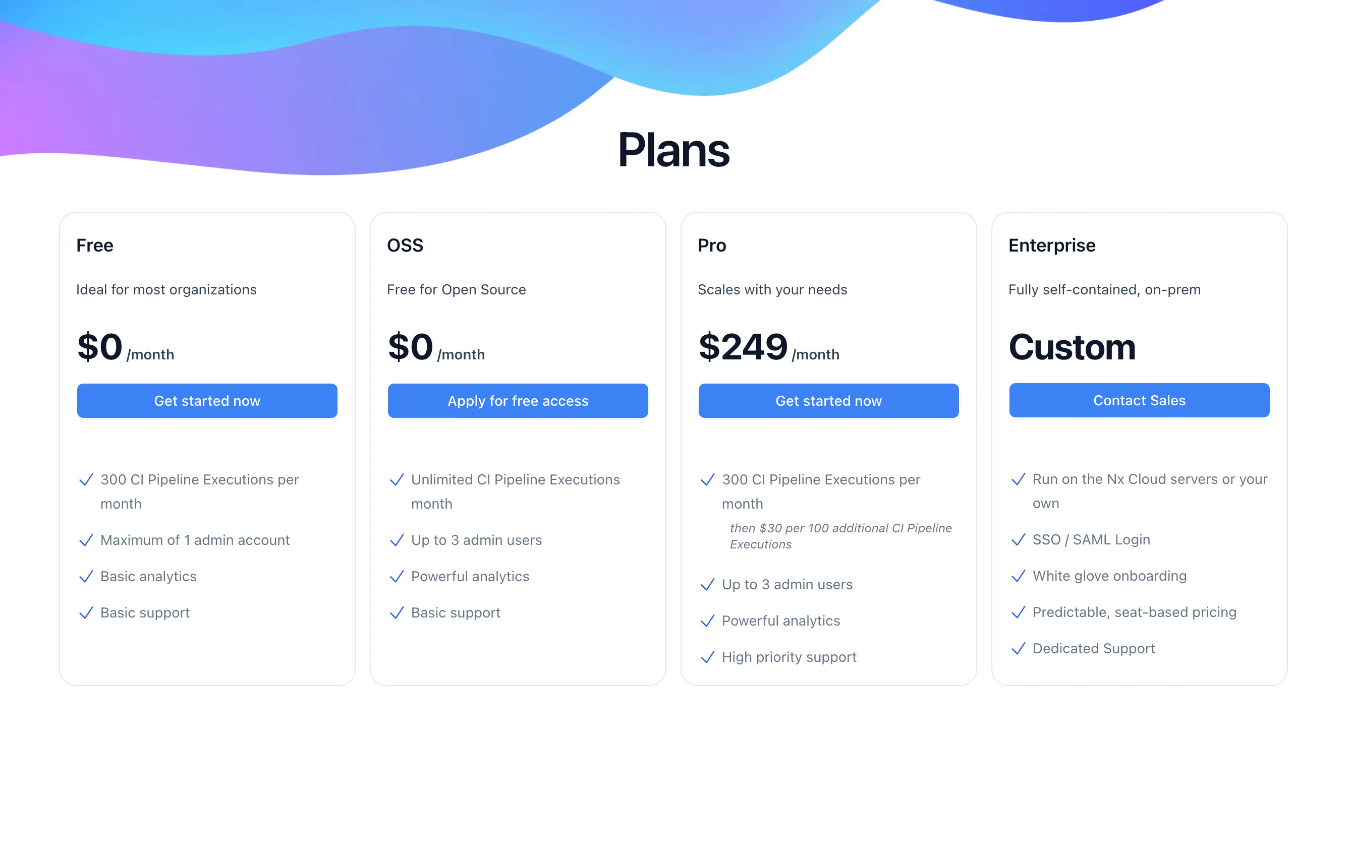 Our Free plan allows one administrator and up to 300 CI pipeline executions per month. Our Pro plan allows more administrators, and uncapped CI pipeline executions, with a flat fee and incremental charges per 100 CI pipeline executions. The OSS plan comes with unlimited CI pipeline executions. Nx has been open source from the beginning and we care a lot about that ecosystem. So this is our contribution to help OSS projects and make their CI pipeline executions faster.