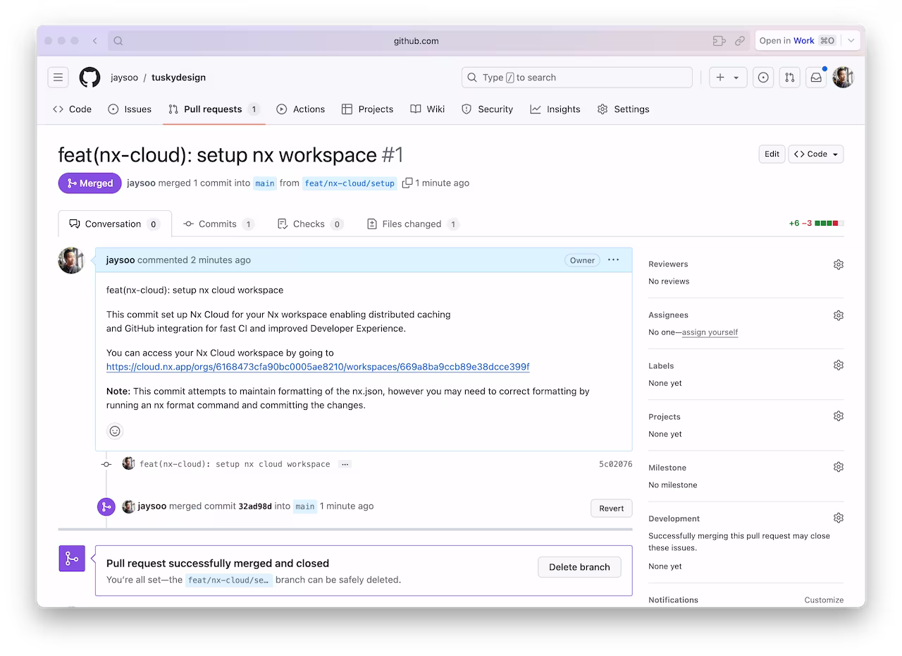 A browser window will open to register your repository in your Nx Cloud account. The link is also printed to the terminal if the windows does not open, or you closed it before finishing the steps. The app will guide you to create a PR to enable Nx Cloud on your repository.